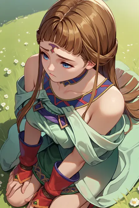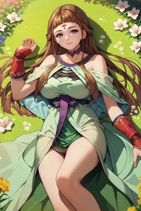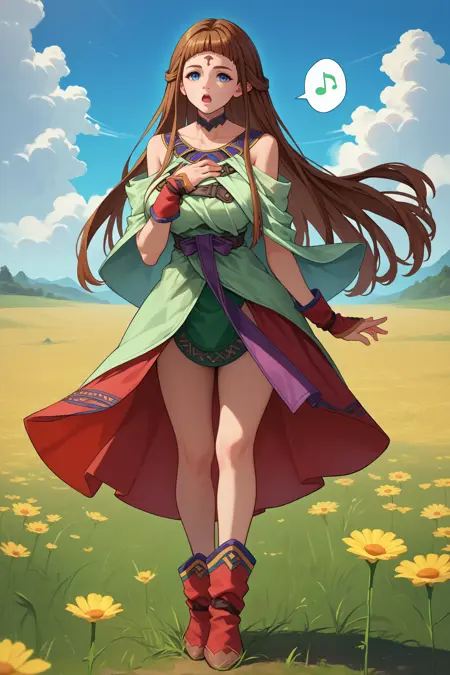 如需展现她的典型形象,请添加“额头标记,项圈,绿色连衣裙,露肩,红色手套,红色裙子”。