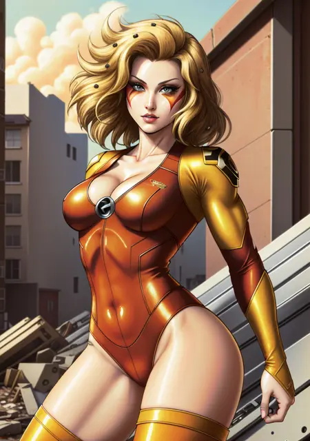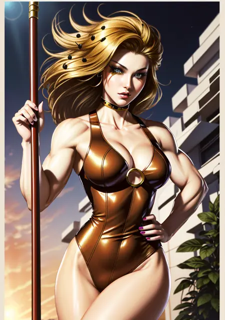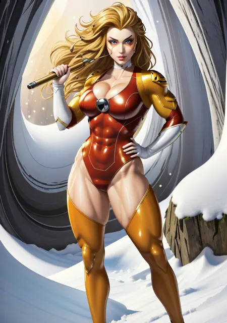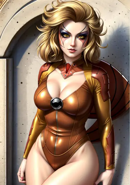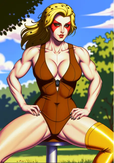 📝🌟 트리거: (CheetaraQuiron 캐릭터), lyco:quiron_Cheetara_v1:1.0, 레트로 아트 스타일, 만화, 얼굴 페인팅, 스킨타이트 보디수트, 메이크업, 레오타르드, 근육질 몸매,