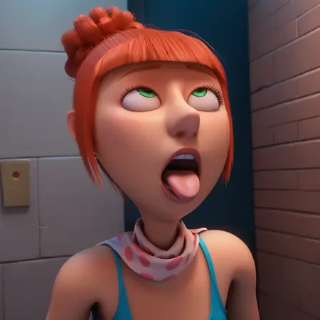 lucydm, green eyes, single hair bun, blue dress, scarf, sleeveless, pointy nose, eyelashes, red hair,