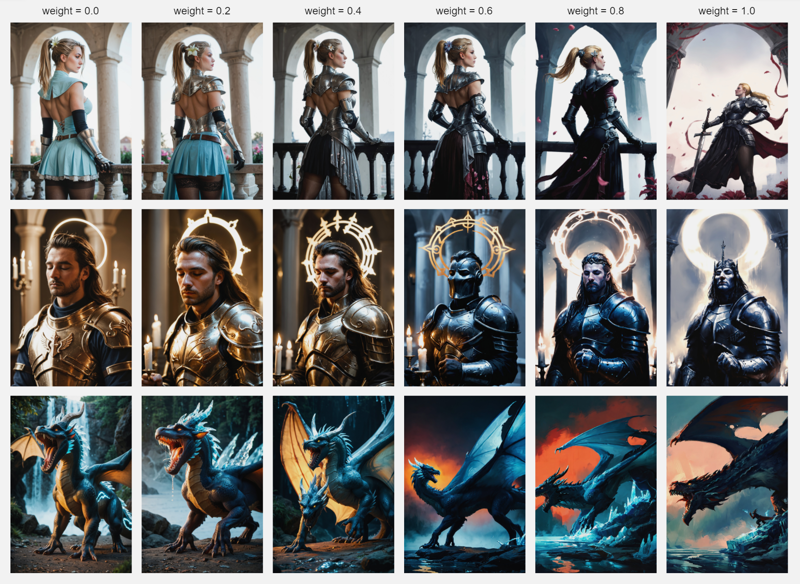 이 LoRA의 가중치를 높이면 생성된 이미지의 다크 판타지 예술 스타일 개념이 점차 강화되며, 최적의 가중치 범위는 0.4에서 0.6 사이입니다. 이 범위를 초과하면 이미지가 점점 덜 사실적으로 변하고 디지털 회화에 더 가까워집니다. 아래 예시를 참조하세요: