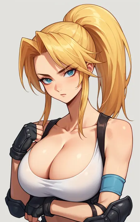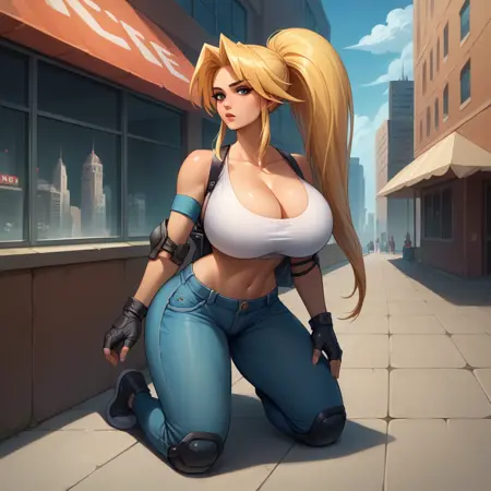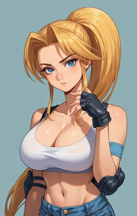 크롭탑, 가슴 선, 팔꿈치 패드, 손가락 없는 장갑, 청바지, 데님