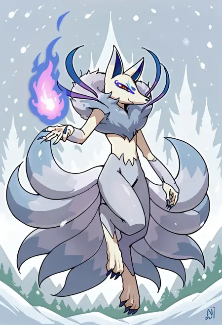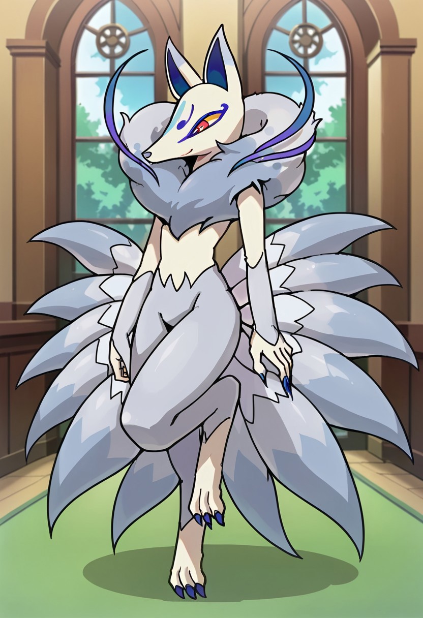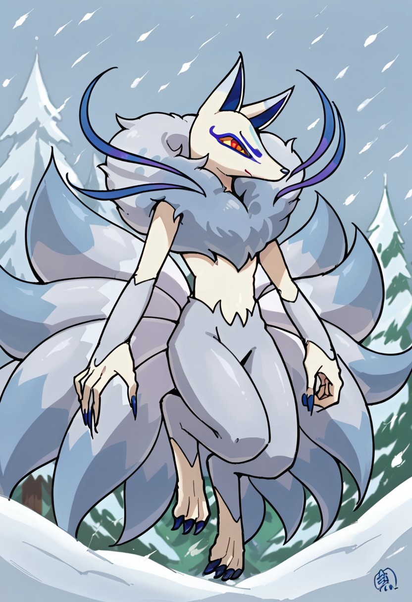 Frostail_Yo-kai, silver fur, gray fur, white legs and torso, nine tails, multiple tails, gray tail tips, long blue nails, blue strands, yellow sclera, red eyes,
