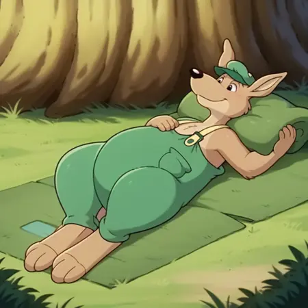 Splodgebb, young anthro, male, kangaroo, tan fur, green cap, green overalls with suspenders
