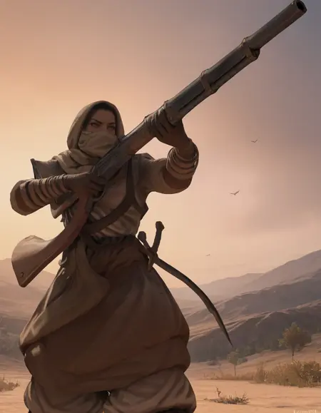 ArabyJezzail, hood, gloves, boots, holding rifle,