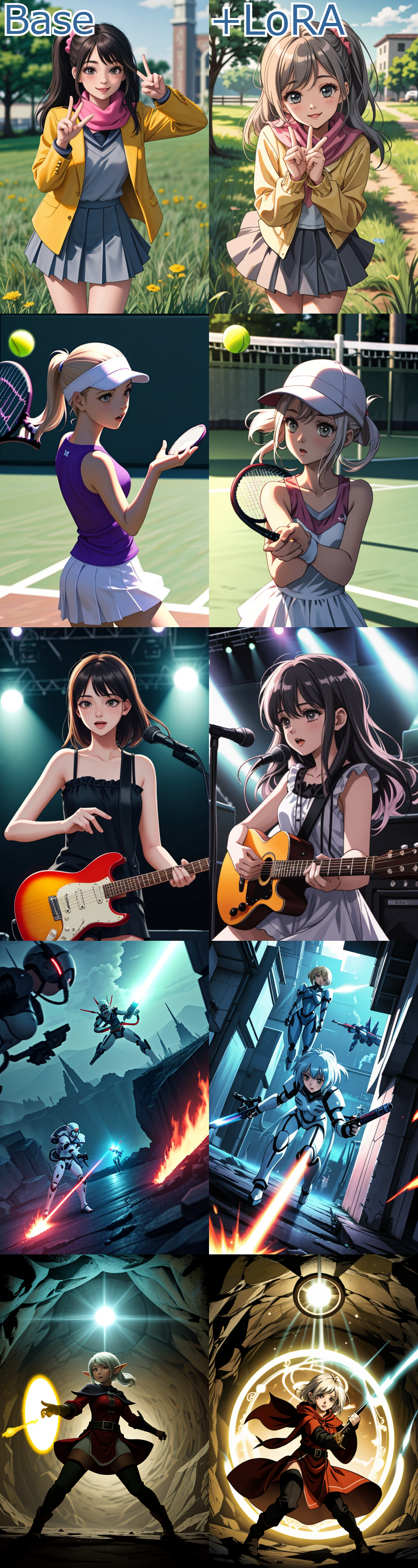 어떤 베이스를 사용하든, 이 부분들을 조정함으로써 제가 평소에 제작하는 캐릭터에 가까운 최종 결과를 얻을 수 있다고 느낍니다(적절히 제작한다면 더 많은 조정 LoRA를 추가할 것입니다). 또한, 사진 촬영을 위한 조정을 하여 전체 이미지 품질을 통제하고, 사진에서 일반적으로 부족한 판타지 요소를 추가합니다. 요약하면, 이 LoRA를 사용하면 제가 선호하는 얼굴의 캐릭터를 제작할 수 있으며, 사진적 표현력을 향상시킵니다.