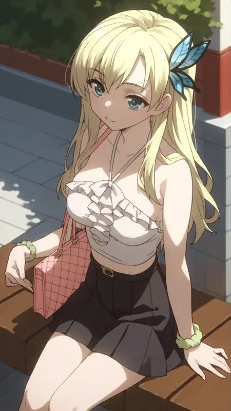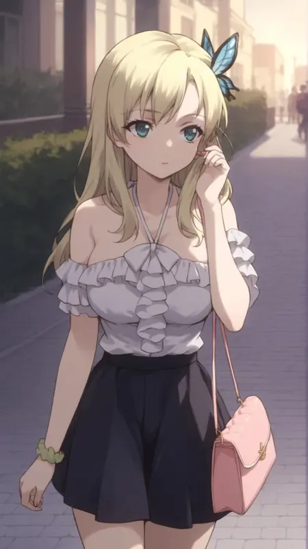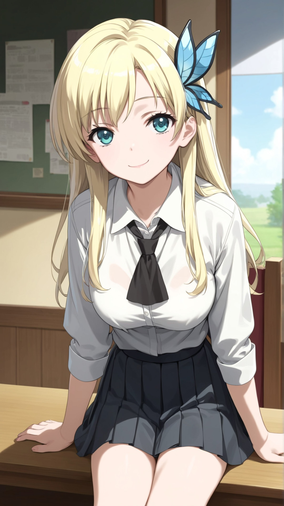 推荐提示词:"sena_haganai, 一位动漫女孩, 1girl, 单人, 长发, 乳房, 看着观众, 微笑, 刘海, 蓝眼睛, 裙子, 金发, 衬衫, 发饰, 嘴闭着, 校服, 白色衬衫, 百褶裙, 室内, 黑色裙子, 蝴蝶发饰, 圣克罗尼卡学院校服,"