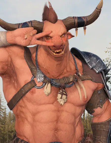 它们常常长到人类身高的两倍,肌肉体量更是远超人类,厚实的头颅宽阔而丑陋,仅凭一记冲撞就能刺穿内脏。许多牛头怪拥有分趾的兽类后肢,以及混沌之力带来的其他身体畸形。虽然它们的智力不如兽人,但力量异常强大,是极其可怕的战士。