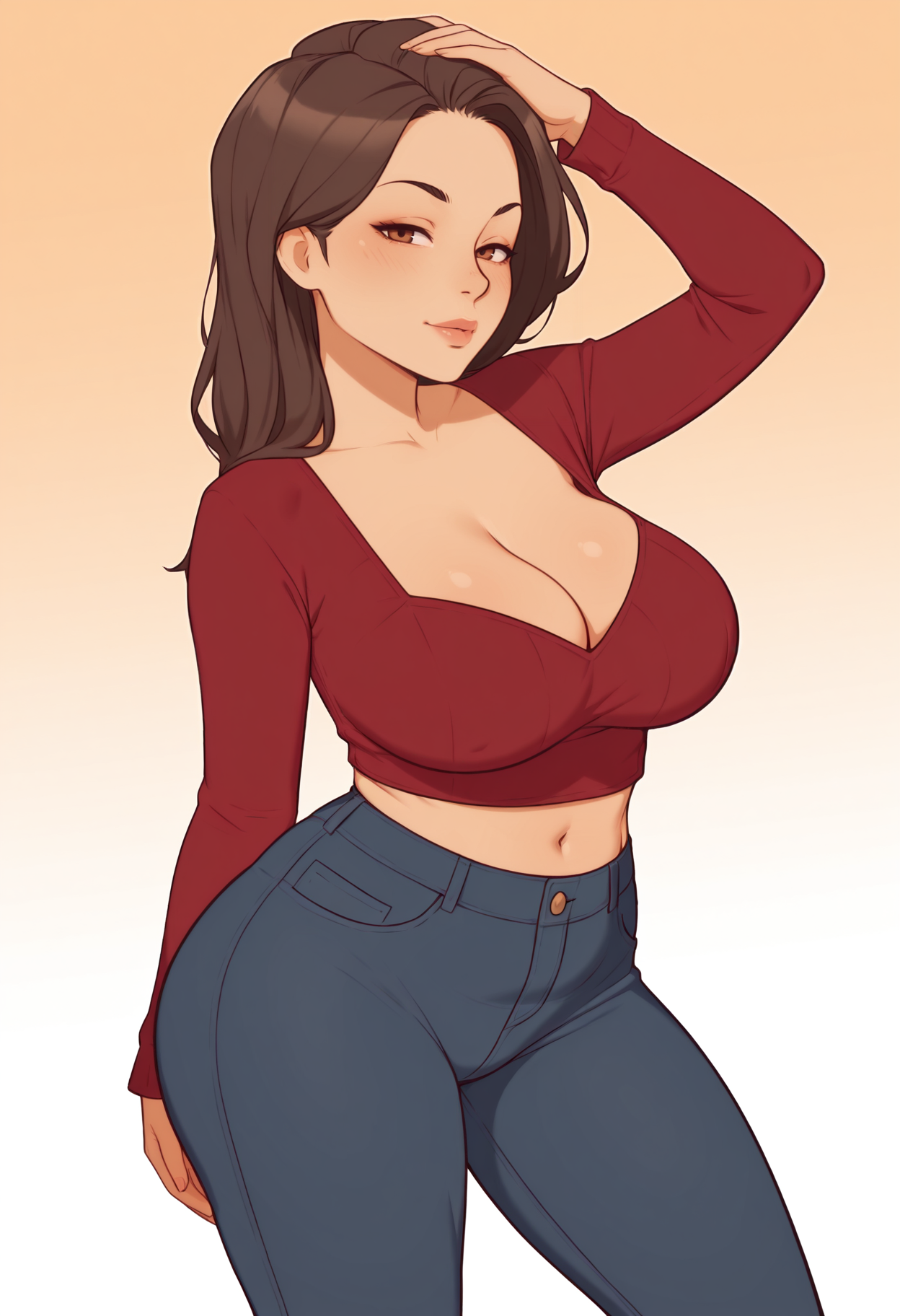 Casual outfit: katewaifuil, cleavage, midriff, pants, denim, red sweater, crop top