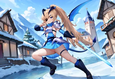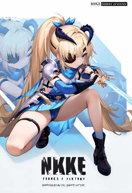 윈터 슬레이어: guillotinews, guillotinewsa_outfit, 1girl, flat-chested, long hair, blue eyes, blonde hair, hair ornament, dress, holding, very long hair, standing, full body, ponytail, weapon, boots, demon wing, horns, socks, sword, black footwear, holding weapon, armor, thigh strap, blue dress, holding sword, eyepatch, high ponytail, shoulder armor, bridal gauntlets, pauldrons