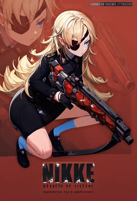 Original Outfit: guillotineog_outfit, 1girl, eyepatch, flat-chested, solo, long hair,blue eyes, blonde hair, gloves, dress, shoes, black gloves, socks, black footwear, uniform, black dress, white socks,