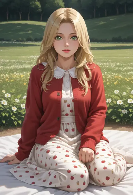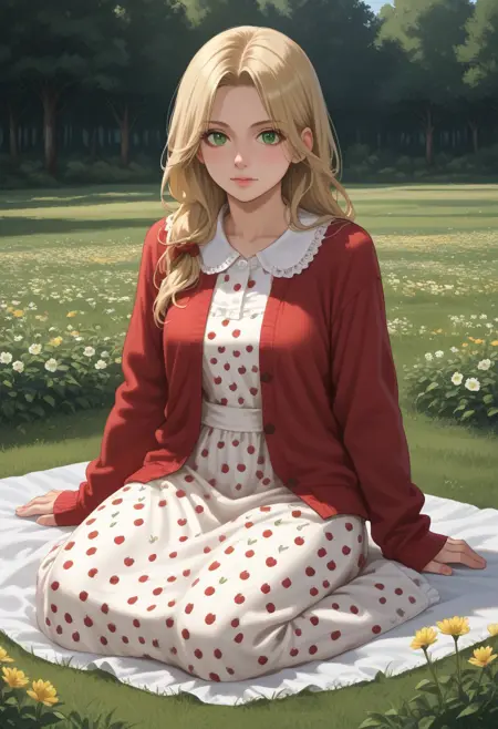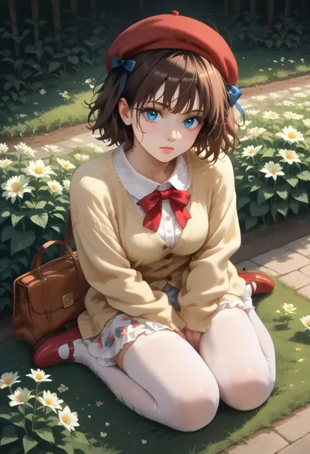 cardigan, purse, beret hat, jewelry, mary jane shoes, stockings