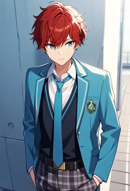 amagiro, 1boy, 남성 중심, 솔로, 빨간 머리, 앞머리, 단발, 눈 사이의 머리카락, 파란 눈, 보석, 귀걸이, 학교 유니폼, 셔츠, 흰 셔츠, 칼라 셔츠, 넥타이, 파란 넥타이, 재킷, 블레이저, 파란 재킷, 긴 소매, 벨트, 체크무늬, 체크바지,