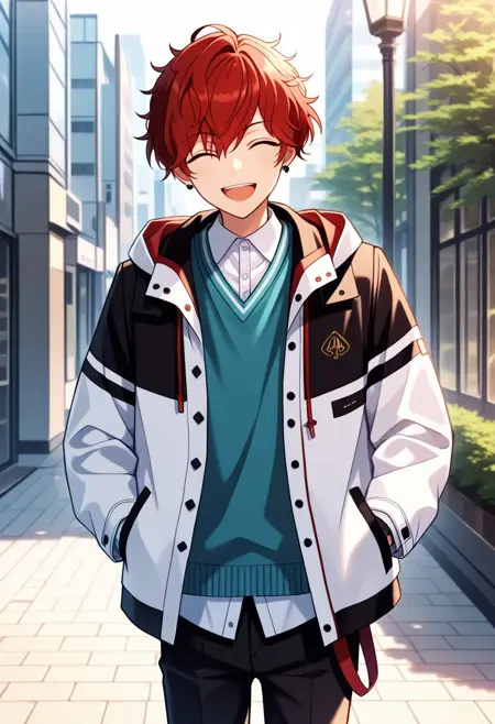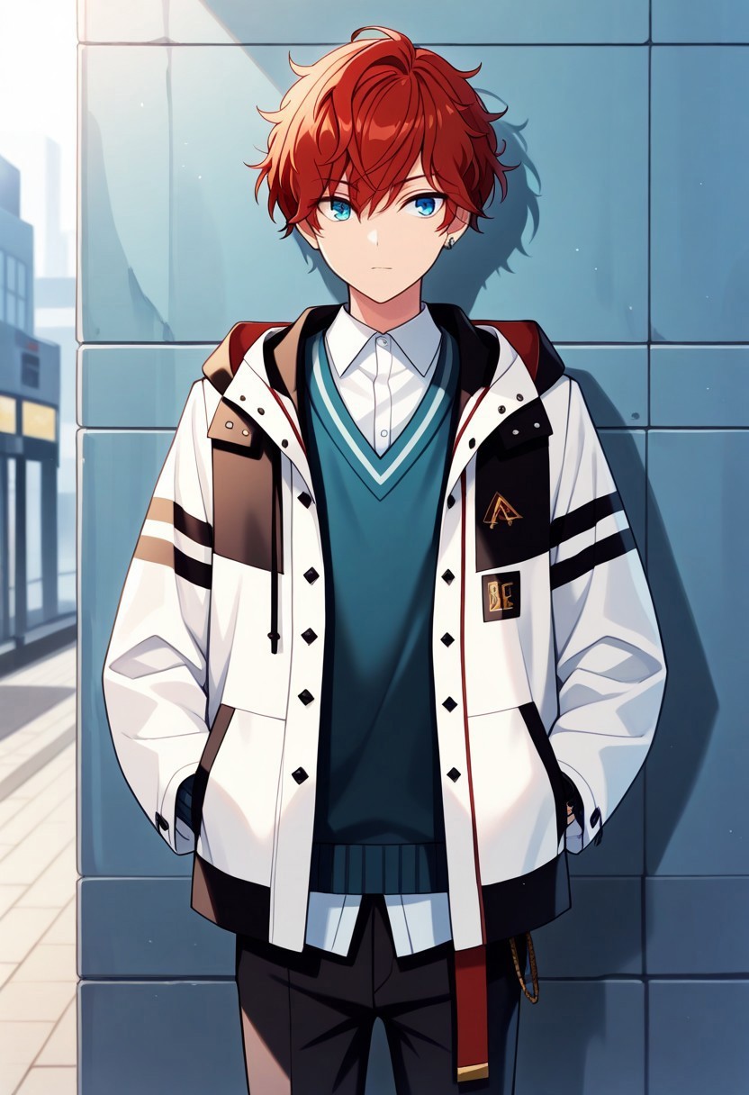amagiro, 1boy, 남성 중심, 솔로, 빨간 머리, 앞머리, 단발, 눈 사이의 머리카락, 파란 눈, 보석, 귀걸이, 셔츠, 흰 셔츠, 칼라 셔츠, 스웨터, 파란 스웨터, 재킷, 흰 재킷, 검은 재킷, 다색 재킷, 열린 재킷, 열린 옷, 후드, 긴 소매, 바지, 검은 바지,