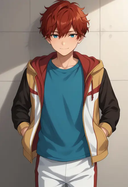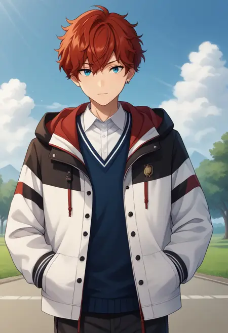 amagiro, 1boy, male focus, solo, red hair, bangs, short hair, hair between eyes, blue eyes, jewelry, earrings, shirt, white shirt, collared shirt, sweater, blue sweater, jacket, white jacket, black jacket, multicolored jacket, open jacket, open clothes, hood, long sleeves, pants, black pants,