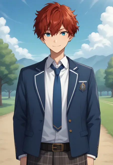 amagiro, 1boy, male focus, solo, red hair, bangs, short hair, hair between eyes, blue eyes, jewelry, earrings, school uniform, shirt, white shirt, collared shirt, necktie, blue necktie, jacket, blazer, blue jacket, long sleeves, belt, plaid, plaid pants,