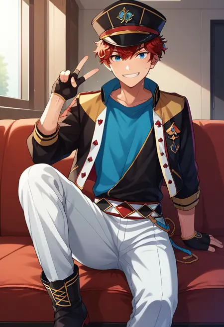 amagiro, 1boy, male focus, solo, red hair, bangs, short hair, hair between eyes, blue eyes, jewelry, earrings, alkaloid uniform, hat, peaked cap, shirt, blue shirt, black shirt, multicolored shirt, jacket, black jacket, cropped jacket, open jacket, open clothes, gloves, black gloves, fingerless gloves, belt, pants, white pants, boots, black footwear,