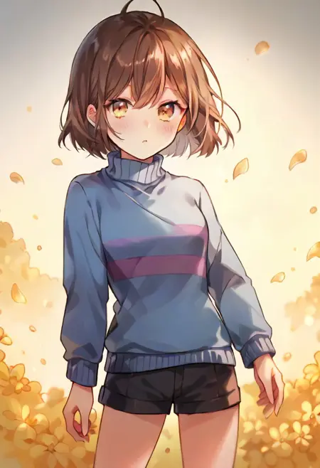 ベースプロンプト: FriskXL11、黄色の目、茶色の髪、紫のストライプ入り青いセーター、ショートパンツ、短い髪、ブーツ