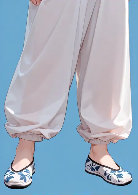 黑色圆口布鞋:black flats, white socks, 或 no socks,