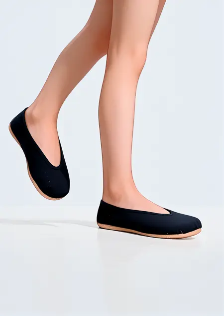 黑色圆口布鞋:black flats, white socks, 或 no socks,