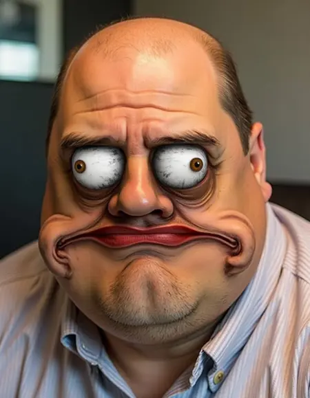 目は不自然に大きく、広く離れており、白目、黒い瞳孔があり、虹彩はない。まぶたは厚く重たく、その周囲にしわがはっきりと見える。