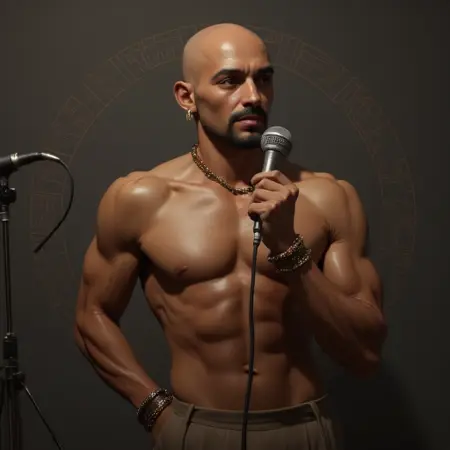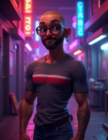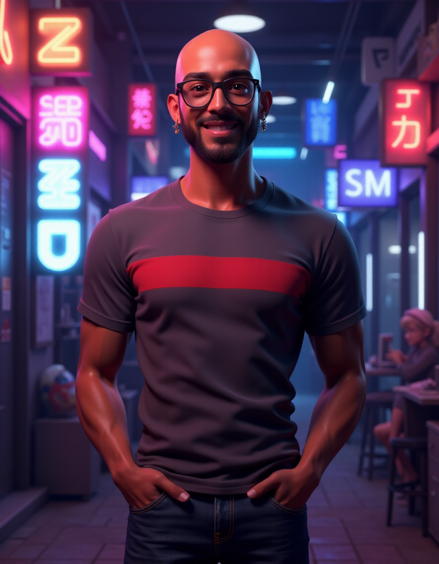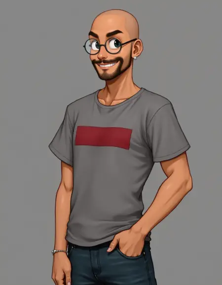1boy,tanned skin,bald,beard stubble, black eyes,grey t-shirt with red stripe,jeans,round glasses,single earring
