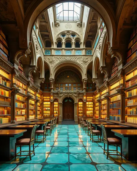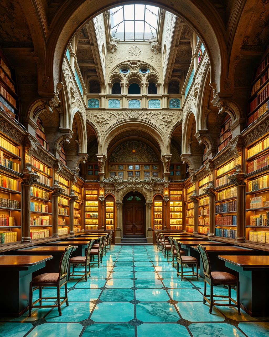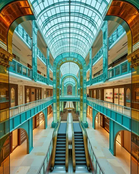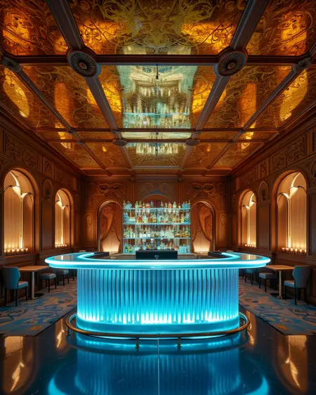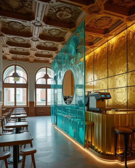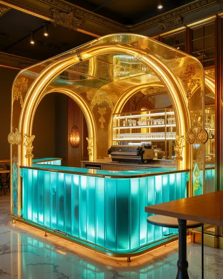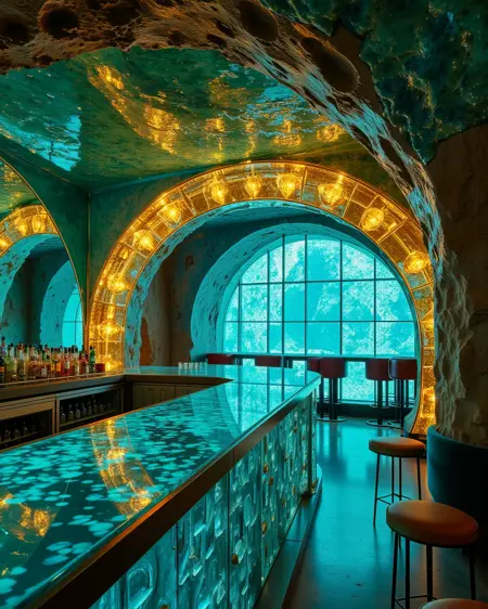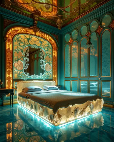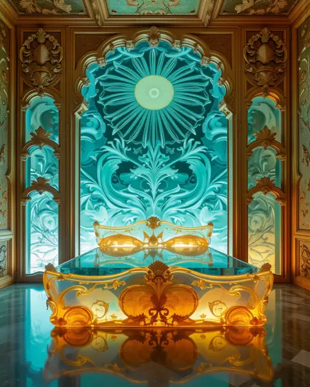 「半透明なターコイズ、ガラス、金葉、反射材」で作られたあらゆる繊細な空間を生成できます。