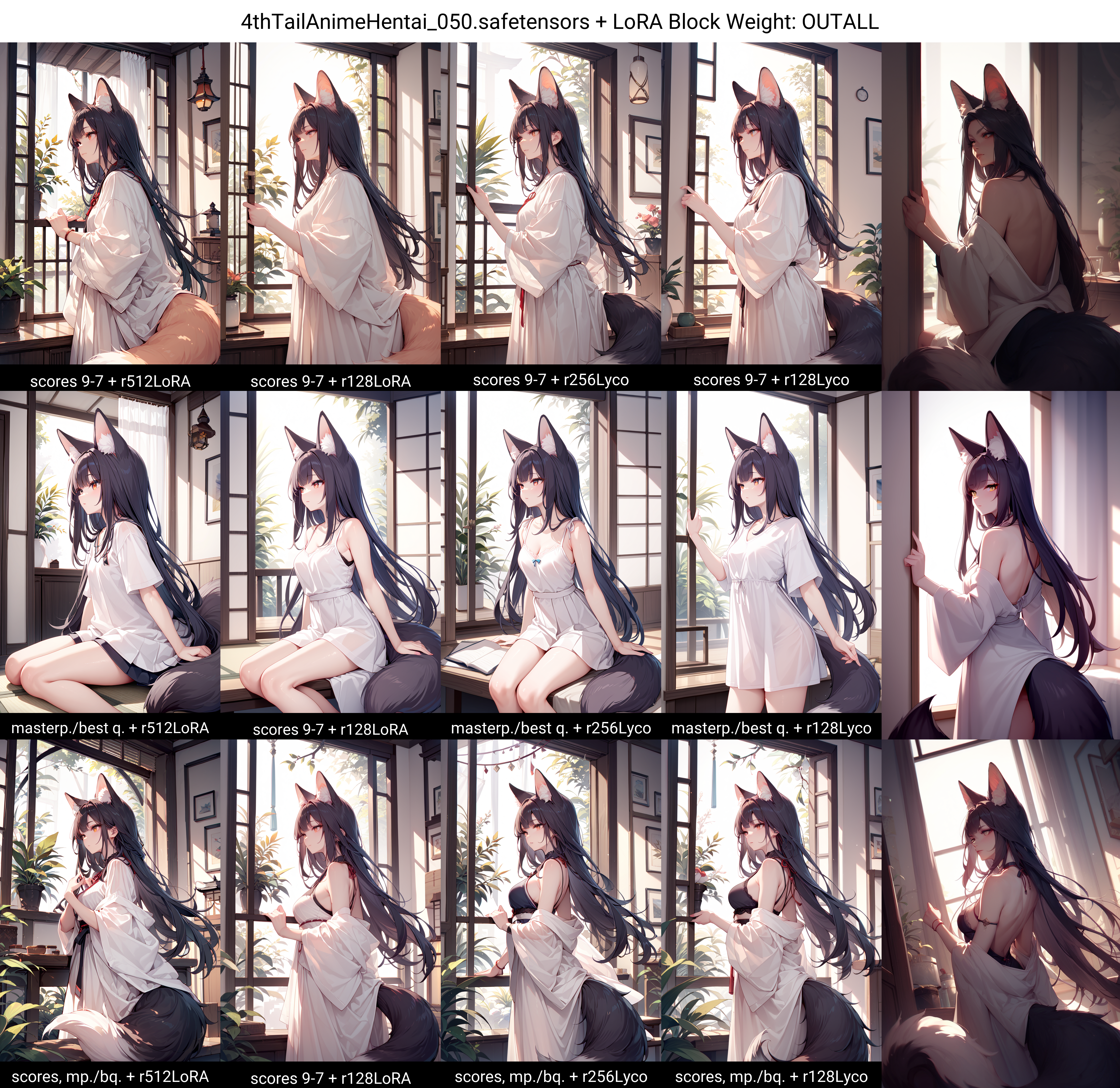 信息说明:0,0,0,0,0,0,0,0,0,0,0,1,1,1,1,1,1,1,1,1 仅会应用 LyCORIS 模型的 OUT 层(与 OUT12 块合并预设完全一致),理论上它会将模型的所有美学/风格应用到检查点上,但若权重设为 1 或将所有层设为 1,效果会更接近原始提取模型,但可能会损失目标检查点原有的构图/概念知识(我不确定这一点,如有错误请指正)。