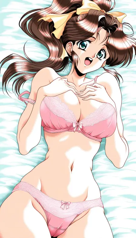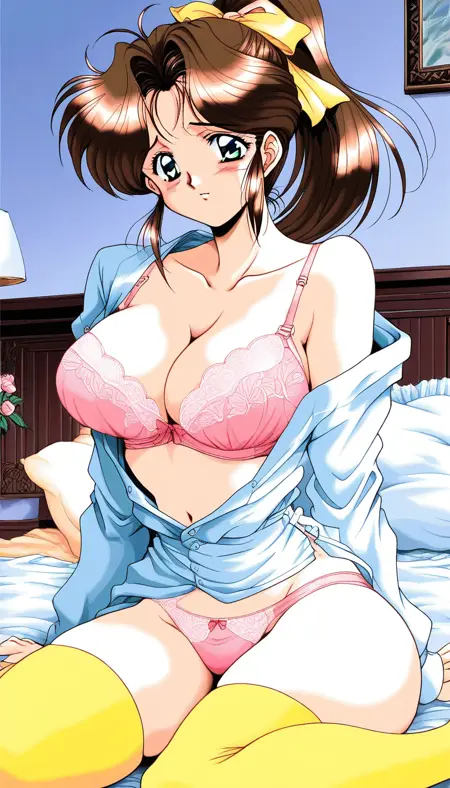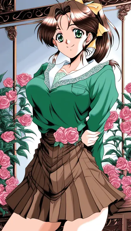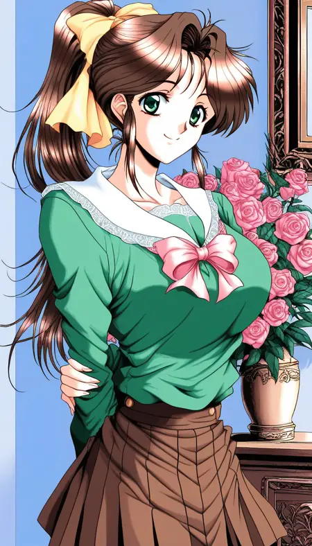 Ymazaki_chika, brown hair, long hair, high ponytail, sidelocks, green eyes, 1990s (style), large breasts, Yellow ribbon, flower, hair ribbon,