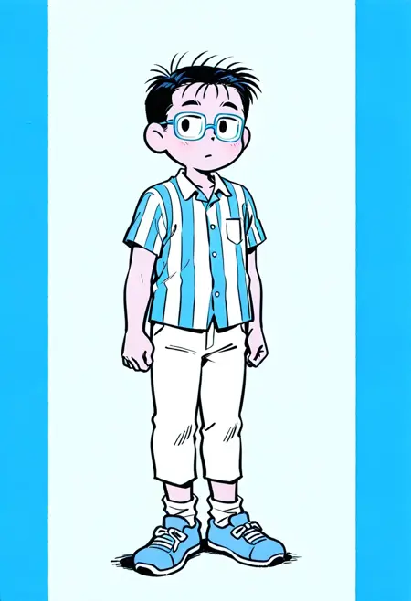 | 학습된 단어 | TeveluisaoTDM, 1boy, blue and white striped shirt, vertical-striped shirt, white pants, brown shoes, light blue square glasses, black eyes, tuffs of black hair, white socks복사됨! TeveluisaoTDM, 1boy, blue and white striped shirt, vertical-striped shirt, white pants, blue shoes, light blue square glasses, black eyes, tuffs of black hair, white socks,복사됨! |