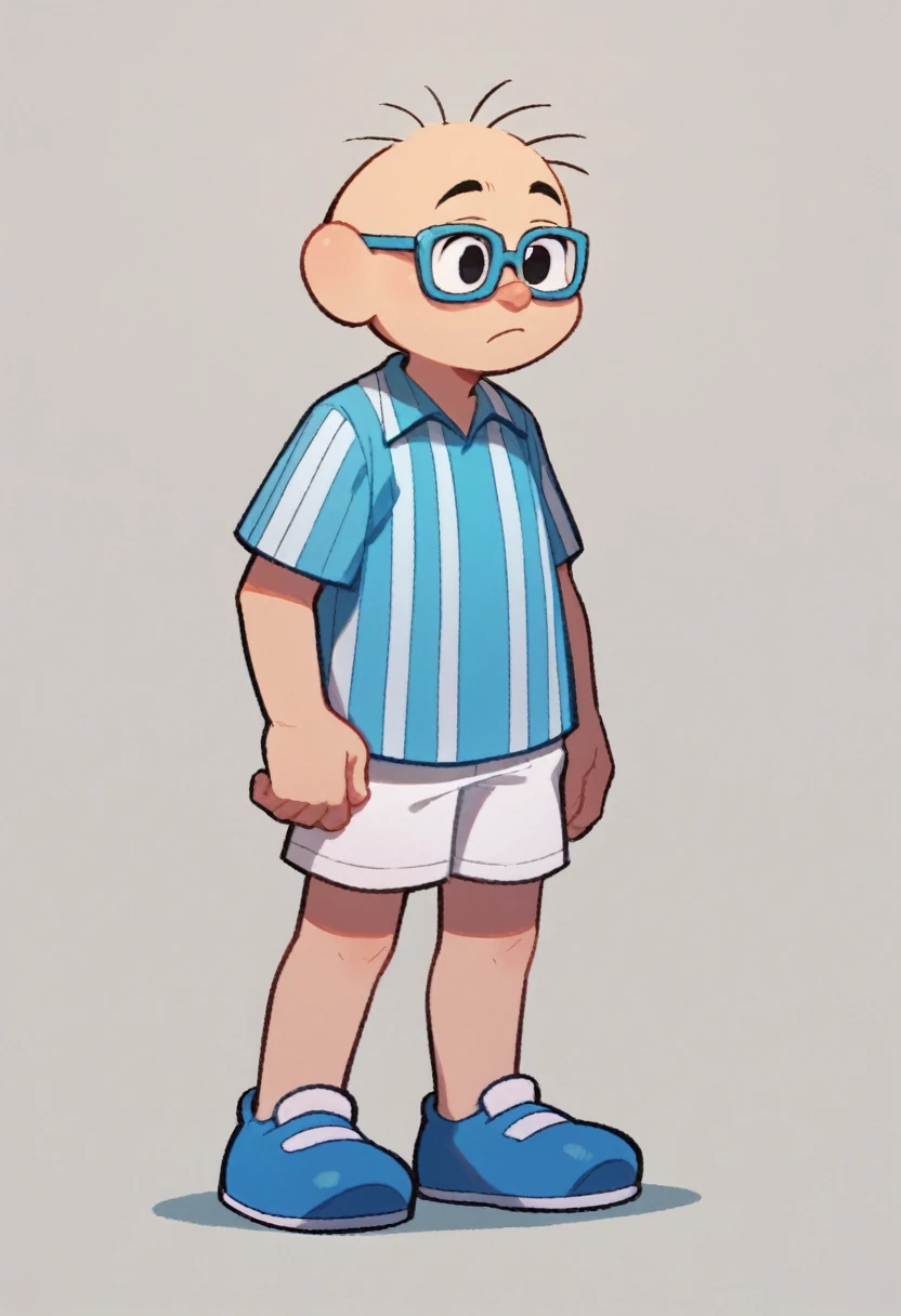 Teveluisao, shirt, 1boy, shorts, glasses, striped clothes, black eyes, blue shirt, blue footwear, white shorts, striped shirt, vertical-striped shirt,