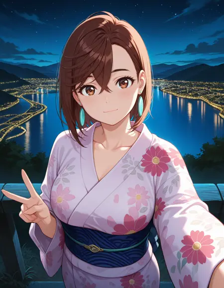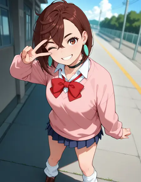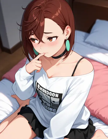 <lora:momo_ayase_anime_v3-soralz:1>, momo ayase,棕色头发,短发,发丝遮眼,不对称刘海,棕色眼睛,耳环,黑色项圈