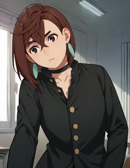 <lora:momo_ayase-dandadan_s1-ixl-anime-soralz:1>, momo ayase (dandadan),棕色头发,短发,发丝遮眼,不对称刘海,棕色眼睛,耳环,黑色项圈