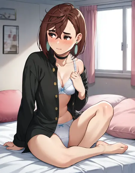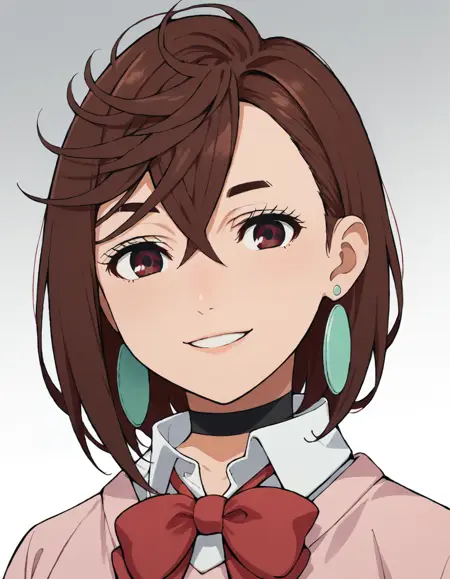 <lora:momo_ayase_anime_v3-soralz:1>, momo ayase,棕色头发,短发,发丝遮眼,不对称刘海,棕色眼睛,耳环,黑色项圈