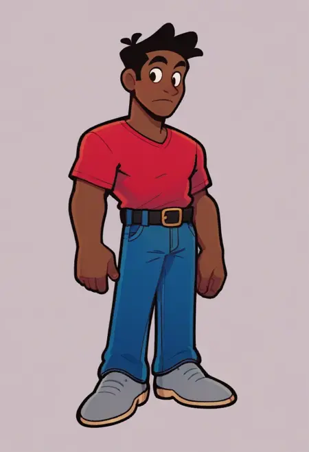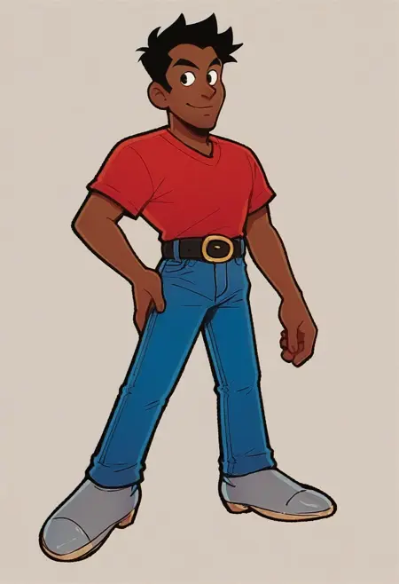 betao, shirt, black hair, 1boy, pants, belt, semi dark skin, semi dark-skinned male, denim, jeans, red shirt, black eyes, grey shoes, black belt