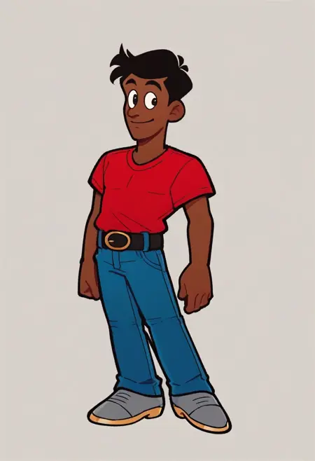 betao, shirt, black hair, 1boy, pants, belt, semi dark skin, semi dark-skinned male, denim, jeans, red shirt, black eyes, grey shoes, black belt