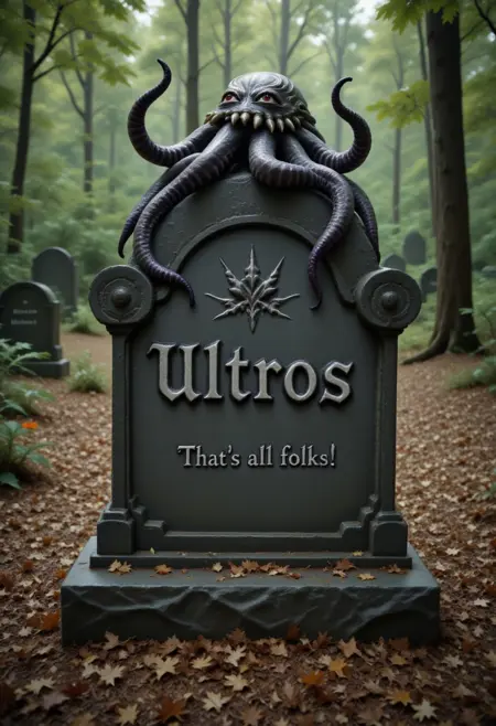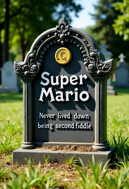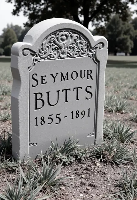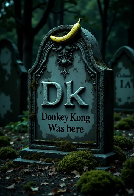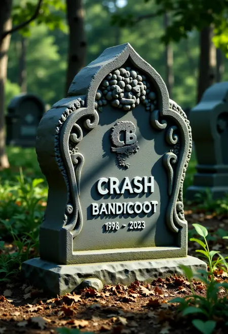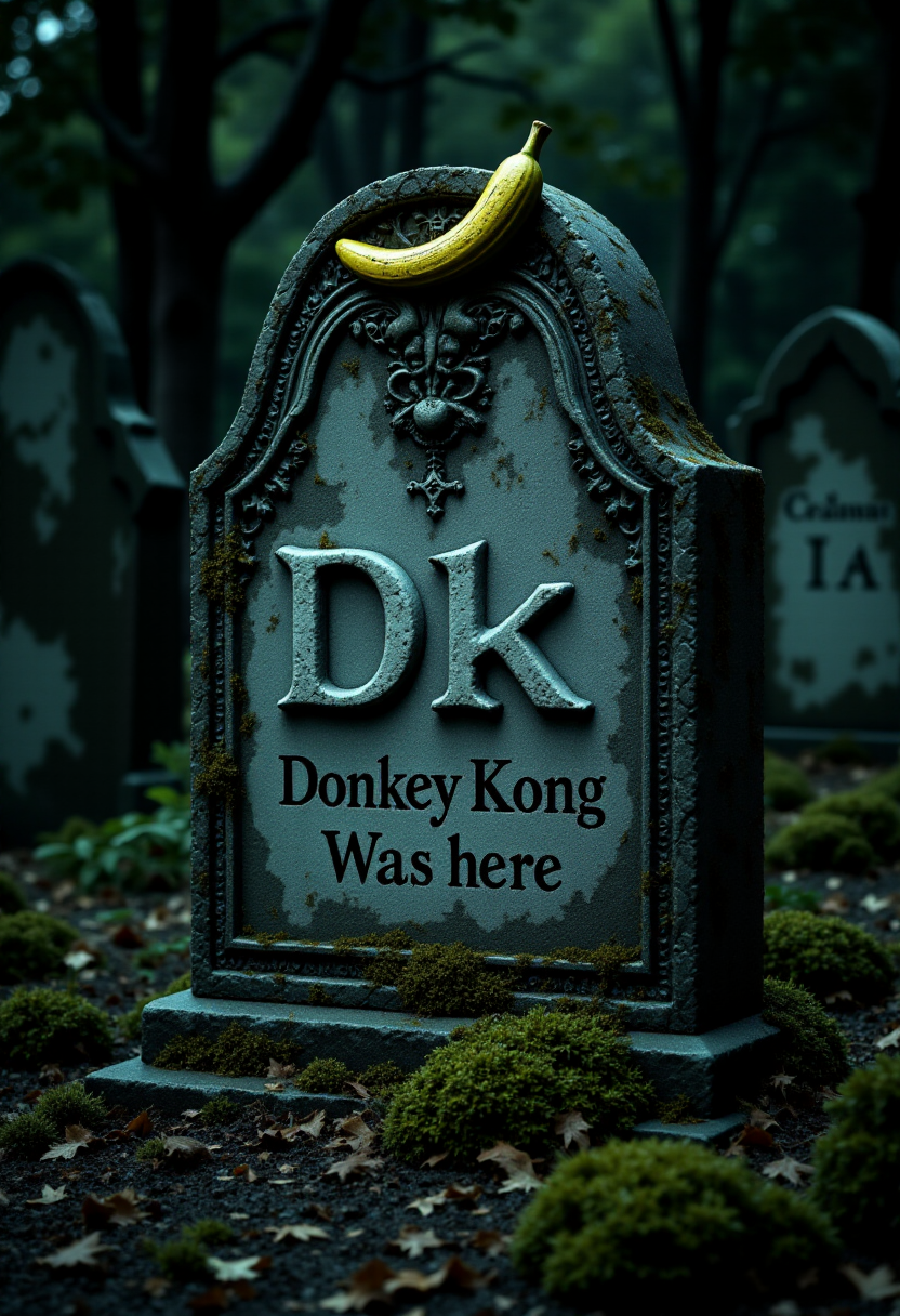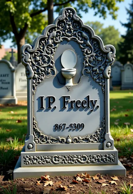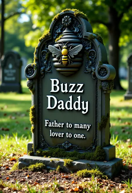 - 这张照片捕捉了一个幽默的户外场景,展示了一座墓碑风格的纪念碑,上面刻有“(NAME)”和年份“(EXTRA TEXT)”。