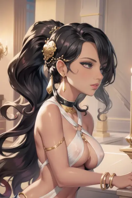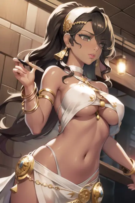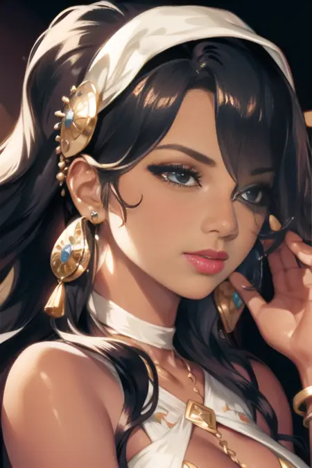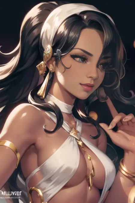 miloyuelle, 1girl, 솔로, 긴 머리카락, 귀걸이, 어두운 피부, 어두운 피부의 여성, 귀고리, 팔찌, 입술, 흉측한 옷, 중간 크기의 가슴, 어깨 노출, 한쪽 눈을 덮는 머리카락, O링, 머리밴드, 파도치는 머리카락, 입술 갈라짐, 배꼽, 절반의 군살, 언더부, 코러, 머리 장식, 묶은 머리, 속눈썹, 메이크업