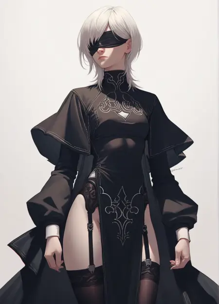 yorha10h, 흰 머리, 검은 눈가리개, 검은 드레스, 캐피릿, 골반 커튼, 코어테일, 레이스 장식, 긴 소매, 가죽 장갑, 가터스트랩, 허벅지 부츠