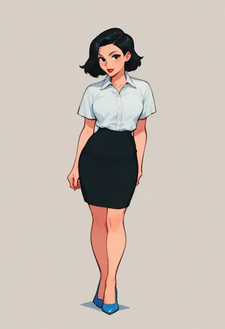 DonaLuisaTDM, 1girl, black eyes, smooth black hair, white shirt, black skirt, blue high heels, red lips, lipstick