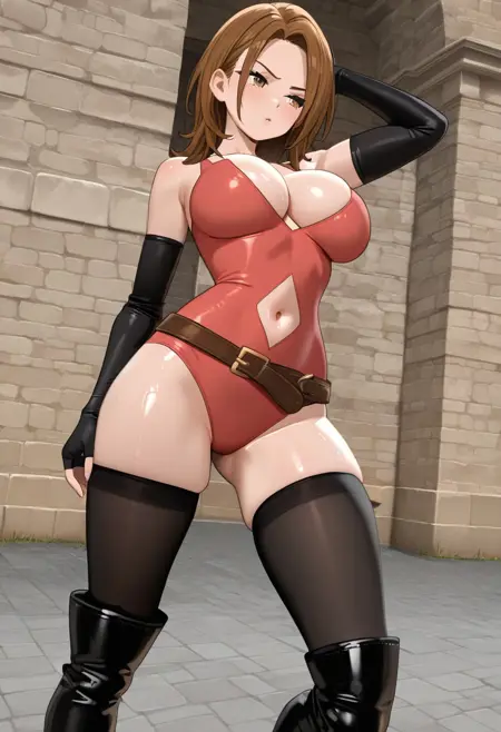 FriesiaBS, cleavage, red leotard, navel, elbow gloves, boots, belt, black thighhighs, fingerless gloves, navel cutout, black footwear, black gloves,