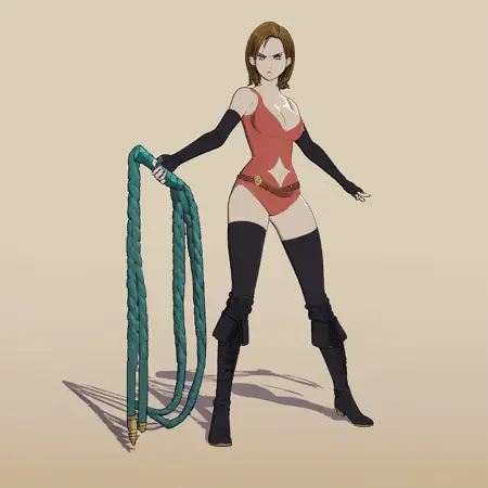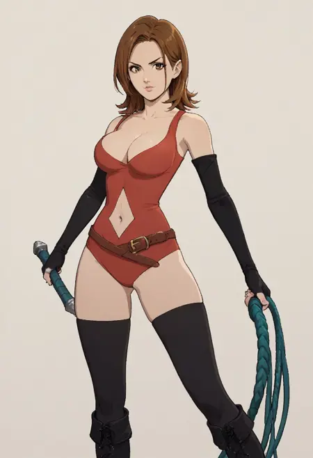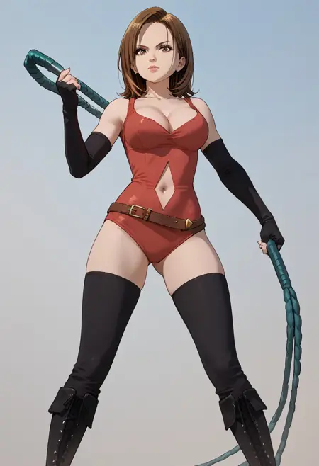 FriesiaBS, cleavage, red leotard, navel, elbow gloves, boots, belt, black thighhighs, fingerless gloves, navel cutout, black footwear, black gloves,