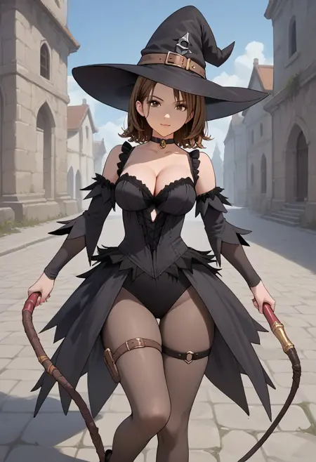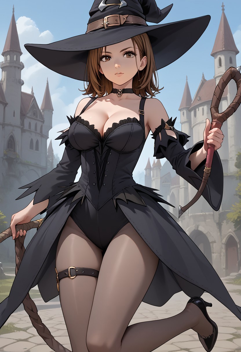 FriesiaWT, pantyhose, witch hat, witch, detached sleeves, cleavage, thigh strap, high heels, choker, dress,