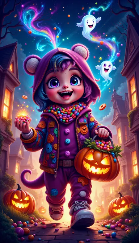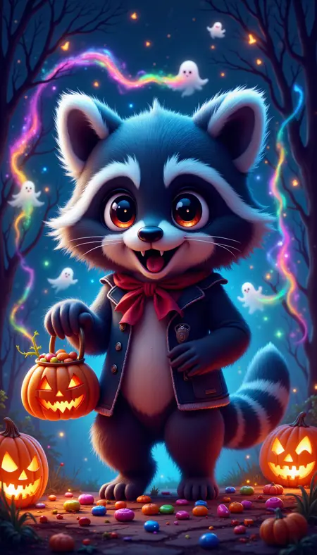 "Mischievous ghostly raccoon with a candy bag is trick or treating. rainbow color scheme"