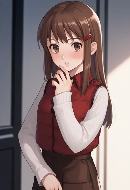 茶色の目、茶色の髪、長い髪、ヘアクリップ、赤いベスト、長袖、白いセーター、リブ編みセーター、茶色のスカート、パンティーホース