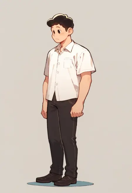 SeuSousaTDM, 1boy, black dot eyes, black hair, white shirt, brown belt, black shoes, black pants,