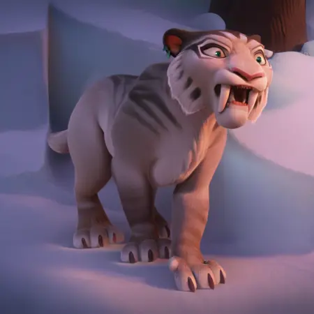 (shira:1.2, saber-tooth tiger), fangs, green eyes, ice age, furry body, silver-grey fur with black stripes,