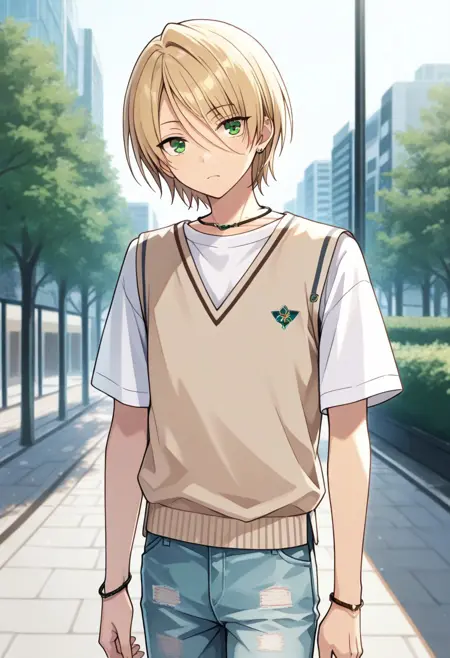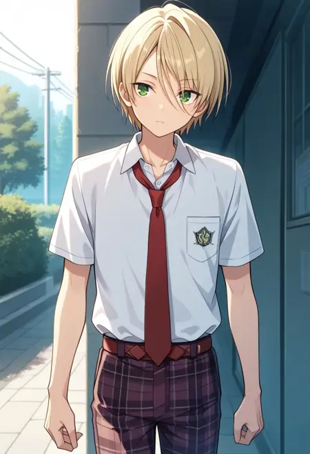 shiratori, 1boy, male focus, solo, blonde hair, hair between eyes, short hair, green eyes, school uniform, shirt, collared shirt, white shirt, necktie, red necktie, jacket, blue jacket, blazer, long sleeves, cardigan, brown cardigan, pants, plaid, plaid pants,