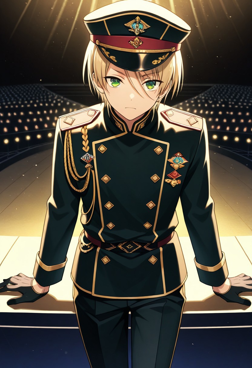 shiratori, 1boy, male focus, solo, blonde hair, hair between eyes, short hair, green eyes, jewelry, earrings, alkaloid uniform, hat, peaked cap, shirt, blue shirt, black shirt, multicolored shirt, jacket, black jacket, cropped jacket, open jacket, open clothes, gloves, black gloves, fingerless gloves, belt, pants, white pants, boots, black footwear,