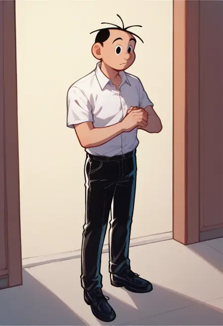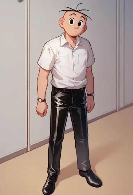 seu_cebola, shirt, 1boy, white shirt, short sleeves, shoes, collared shirt, pants, black eyes, black pants, black shoes,