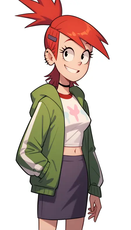 Negative tags: 3d, realistic, jacket (could help with a more cartoon look, also sometimes her green jacket appears when using other clothes)